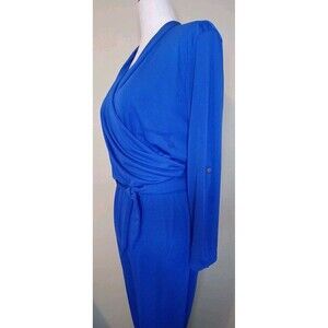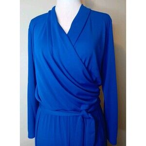 This Jean-Louis Scherrer jumpsuit in size small features a V-neckline, a wrap front top with a wrap tie belt, banded jogger pant hem, and 3/4 roll tab sleeves. Made of polyester knit fabric, it has a slimming and stretchy fit with a belted waist. This vintage piece in a solid blue color is suitable for various occasions and seasons, offering a classic and colorful style with a touch of 90s flair.