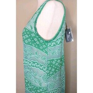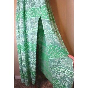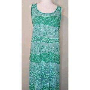 This is a Jean-Louis Scherrer maxi dress in size small, featuring a green color with floral burnout stripes. It has a sleeveless design with a scoop neck and a pullover closure. Made of viscose knit fabric, the dress is maxi length and perfect for summer or spring occasions like travel, parties, or casual wear. It has slimming features, a side slit, and raw frayed hems.