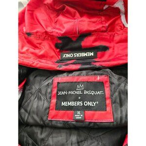 Jean-Michel Basquiat Members Only Jacket features vibrant graffiti art design in red and black. This XL jacket is perfect for art enthusiasts and collectors seeking a unique fashion statement.
