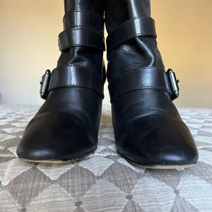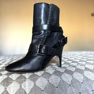 Jean-Michel Cazabat Vita Wrap Strap Black Leather Ankle Boots Women EU 37.5/US 7. These high quality booties have a wrap strap that is unique to each boot. One has a longer strap & extra buckle as shown in the photos. Some scuffs to the leather & wear to the soles, but overall in good condition. Please consider bundling for the best deal. Thank you for shopping.