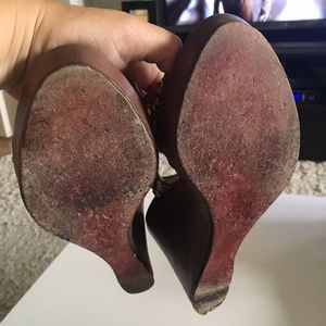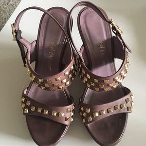 Purple/taupe colored double band wedge with gold metallic studs, sling back strap with buckle. Real leather and made in Spain. Little over 4" Wedge. No trades.