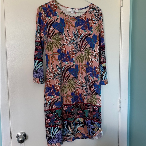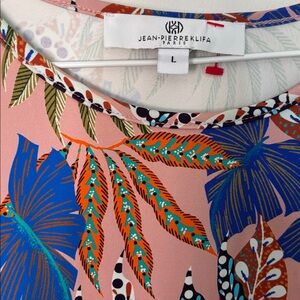 Jean-Pierre Klifa Paris Size Large Vibrant tropical print Daphne dress with 3/4 sleeves. Features a mix of blue, pink, and green colors. Nylon spandex mix gives perfect amount of stretch, shape and cling. You will love this dress!!!! Like new. No wrinkle, perfect for travel.