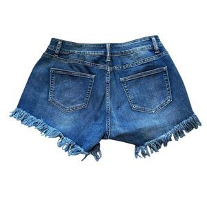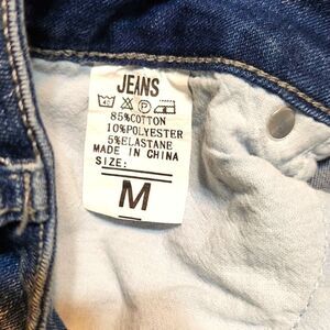 Denim distressed jean shorts with pockets on the front and back. The material is 85% Cotton, 10% Polyester and 5% Elastane. There is a button closure. As far as I know the brand is Jeans like it says on the tag in the picture above.