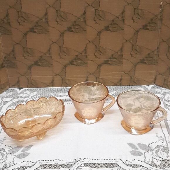 3 pc. bundle of depression glass Jeanette Florigold candy/nut dish Marigold Louisa Pattern carnival glass, & set of 2 Florigold cups. Preowned and in excellent condition.