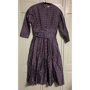Fit and Flare, Twirl Skirt. Crew Neck, Buttons down to waist, Knife pleats on chest, Pleated "cumberbun" waist accent, pleated full skirt, Zipper and hook and eye for closure on back. 3/4 Sleeves - There is an extra 4.5" in bottom hem, should you like to make it longer.