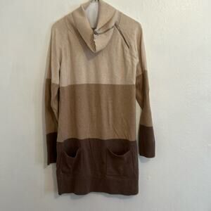 Jeanne Pierre beige tan coco Color block long sleeve tunic sweater with 2 front pockets. The large cowl turtleneck has a zipper for easy entry. Beautiful neutral colours, rib knit cuffs and hem with 3” side slits. Excellent used condition