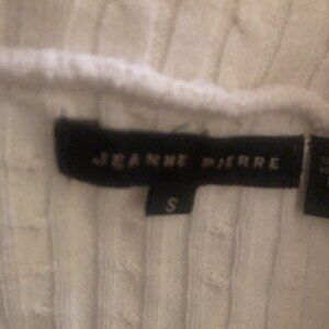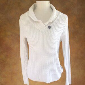 Stay warm and stylish in this Jeanne Pierre women’s cable knit sweater (size Small). Designed in a crisp white knit, it features a shawl collar with a rich brown button decor for a cozy, elegant look. An extra button is stitched inside for convenience.