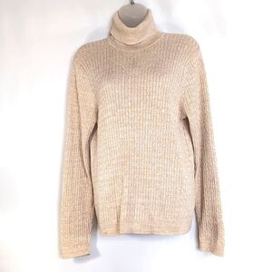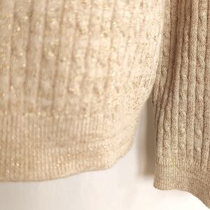 Jeanne Pierre Long Sleeve Cream & Gold Glitter Turtle Neck Sweater. Gorgeous Cotton Blend Cream Colored Cable Knit Sweater with a Metallic Look Golden Thread Glitter throughout. Size XL. Excellent Pre-Owned Condition. No Flaws.