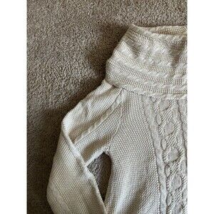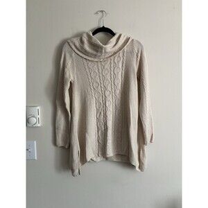 Classic and comfortable knitwear from Jeanne Pierre. This long sleeve sweater features an oversized fold over turtleneck design with gorgeous cable knit detail throughout. Made with comfortable 100% cotton fabric that is lightweight and breathable Sweater has a slightly stretchy design and is more of a tunic length. Perfect for fall, winter, and spring. Ivory/cream/beige color, a great neutral piece to add to any wardrobe. Pairs perfectly with jeans, pants, or leggings. Great casual and loungewear that can be dressed up for preppy and coastal wardrobes.