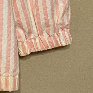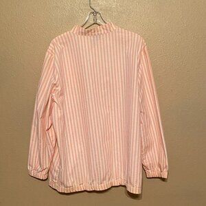 Jeanne Stuart Pink & White Striped Shirt Zipped front Rose Applique Approx (L). This lovely long sleeved, zipped front top can be layered with a light tank top or worn alone. It features a cute rose applique and elastic around the waist and sleeve cuffs.