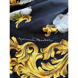 This item is a Jeannene Booher For Maggy London Scarves black scarf with white flowers and gold scrolling. 100% silk scarf in euc from a smoke free home. Approx measurements 41"