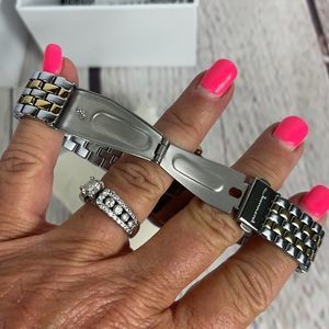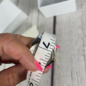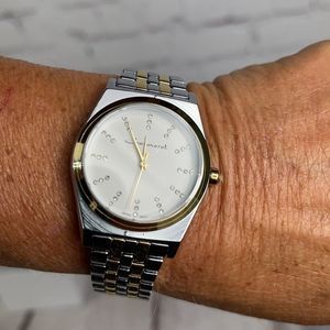 Silver and gold tone band with white dial face. The Jeanneret is simple, a classic design proven over the years, but with a twist. The beautiful Czech crystal hour indices are a perfect mix between subtle and too much. Fold over clasp. In Excellent condition, in working order and worn one time for a few hours. In excellent condition with no scratching on the face.