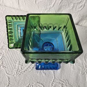 1960s Jeannette Glass Company crystal wedding box. Features a beautiful green to blue gradient ombre faded, matching lid, and built in pedestal. No cracks or chips, the colors are coming off in some areas, but that doesn't take away from the overall beauty. Traditionally wedding boxes were made to hold a slice of wedding cake for a couple to share on their first anniversary. Today you can use this to store anything from special trinkets to a fancy candy dish.