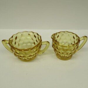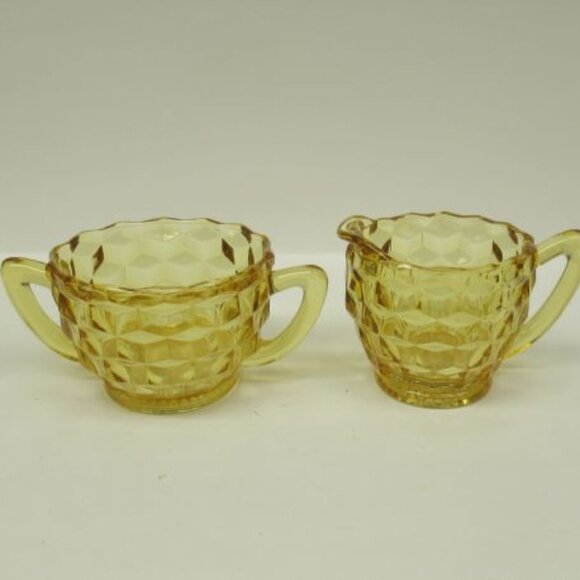 This pretty yellow or amber Cube, aka Cubist, depression glass Creamer and Sugar set was made by Jeannette Glass from 1929 to 1933. Due to the unusual color, this set may have been made by Hazel Atlas in the same time frame. This creamer and sugar each measure 2 1/2 Inches high and are both in very good condition with no chips, cracks or scratches. Be sure to search our various vintage creamer and sugar sets available.