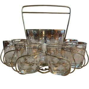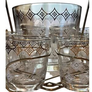 This Mid-century barware set features 22-karat gold and white atomic design on the glasses and ice bucket. It will be a conversation piece and will stand out and be a wonderful addition to your cocktail and bar collection.