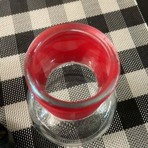 Vintage Jeannette Glass Coffee Tea Bottle Red Thermal Band Bakelite Lid Carafe Description : Vintage Jeannette Glass Co Coffee Carafe Lot of Two. Both have black bakelite lids. Red Thermal holders on the neck . Each measures about 5-1/4 inches tall x 3-1/2 inches across. Bottom is labeled The Jeannette Glass Co J-2517 . Very good condition. No chips o r sc ratches .