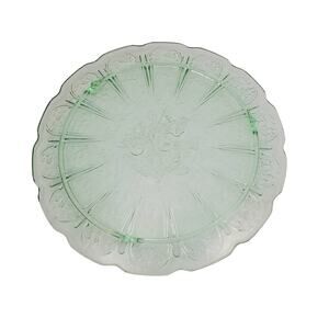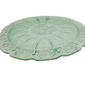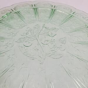 Vintage Jeannette Cherry Blossom Green Depression Glass Footed Cake Plate 10 1/4 inches wide.