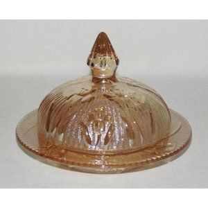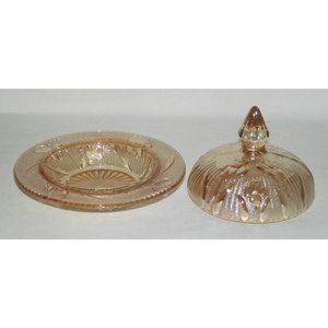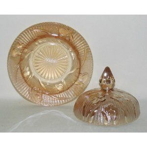 Jeannette Glass IRIS AND HERRINGBONE Marigold Iridescent Butter Dish with Lid