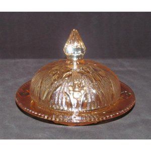 This is a nice marigold iridescent round butter dish with cover in the Iris and Herringbone pattern. It was made by the Jeannette Glass Co. from 1928 to the 1950's. It measures 4 1/2 inches tall and 6 inches wide.
