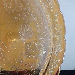 The platter is a vintage piece of iridescent glass, also known as carnival glass, in the Floragold Louisa pattern produced by the Jeannette Glass Company in the 1950s. The name Louisa was a collector's nickname given to the pattern due to its similarity to an older Westmoreland pattern. The color is often described as iridescent amber, Marigold, or peachy gold. The platter is round and measures approximately 13.5 inches in diameter. With a scalloped edge, it features a mold edged flora and vine design on the underside, while the top surface is smooth. This piece is beautiful and in very nice condition. There are no chips, cracks, breaks or damage to this piece. There is a manufacturer's drip mark. It appears as a darker area in the glaze. I point it out in the pictures with my finger. Non smoking pet free home.