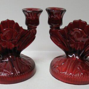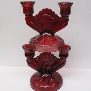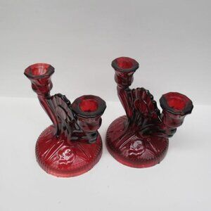 Jeannette Glass Ruby Flashed IRIS and HERRINGBONE Double Branch Candle Holders