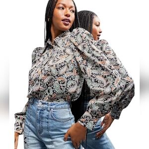 Jeannie Mai X INC Shoulder Pad Button-Front Shirt Navy Blouse Paisly XL