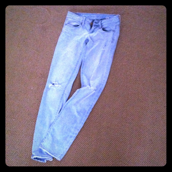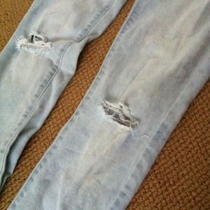 Worn only once, I grew out of them really quickly due to my eating habits smh. They are ripped a little at the knee- light wash. They are skinny, and are the stretch type that after you wear a little bit will loosen up. ALSO they are regular length and everything