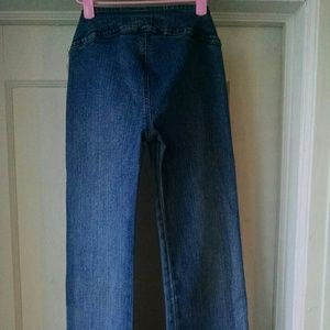 Unique style jeans with low rise front and attached front belt. Jeans has wide leg bottoms and long in length.
