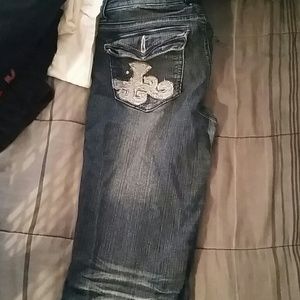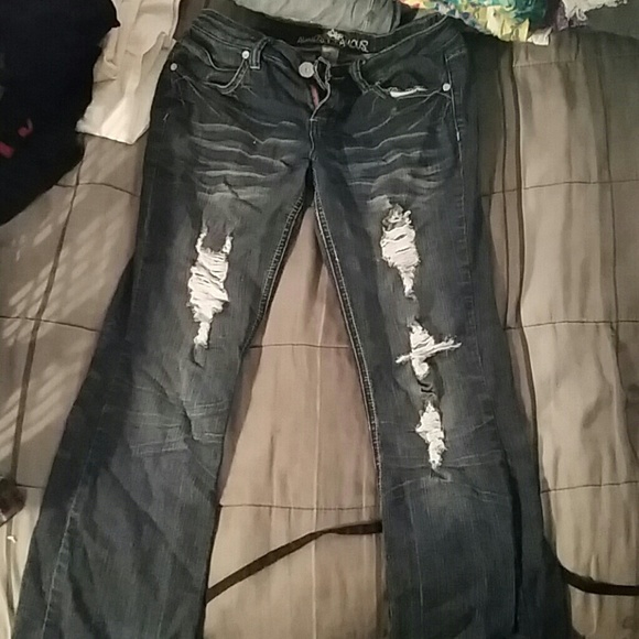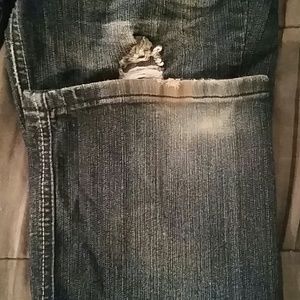 Worn jeans. Very dark in color. Tears down the front of the leg for that sexy look. Little worn on the bottom on the leg.