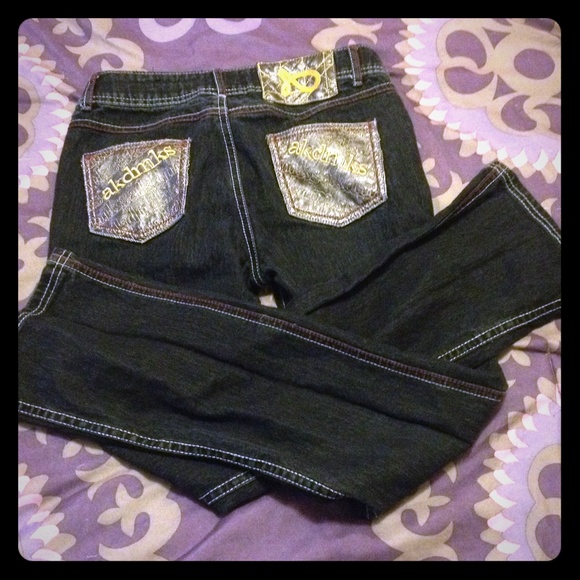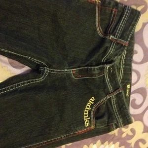 Black jeans, red and white trimming. Gold writing in front and back of pants. Perfect condition no hole rips or tears. For sizing, they run extremely small. Price is negotiable.