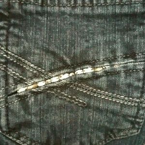 Jeans with embellished pockets. Slightly Worn On Hem Bottom. 17" leg opening, 32" inseam