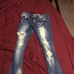 Holy distressed skinny jeans, with a yellowish color to them. Worn once