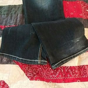 Only worn a few time. Very comfortable jeans. No rips on jeans. The bottoms are more worn due to being too long for me. Other than those spot jeans are in excellent condition!