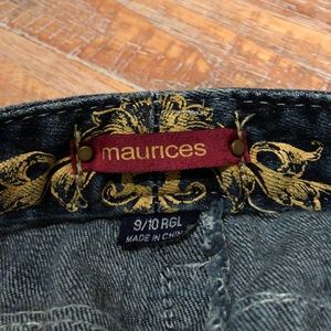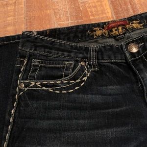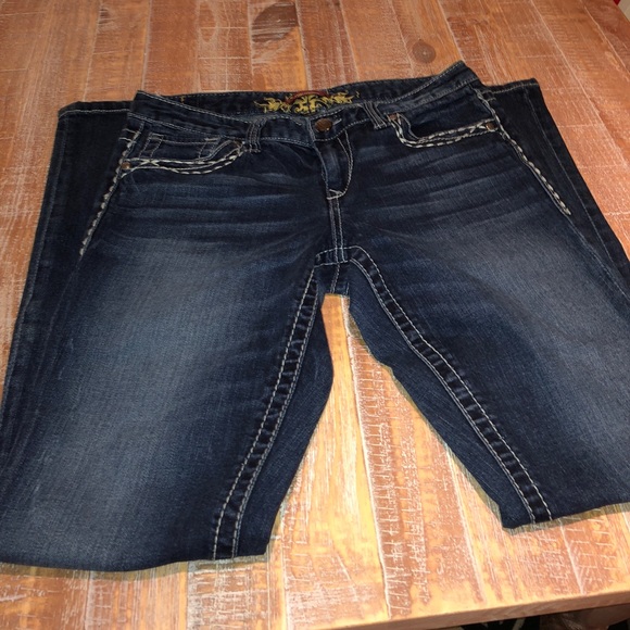 Denim with white stitching. Slight fraying at bottom of jeans in back.