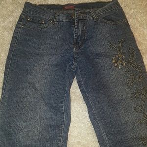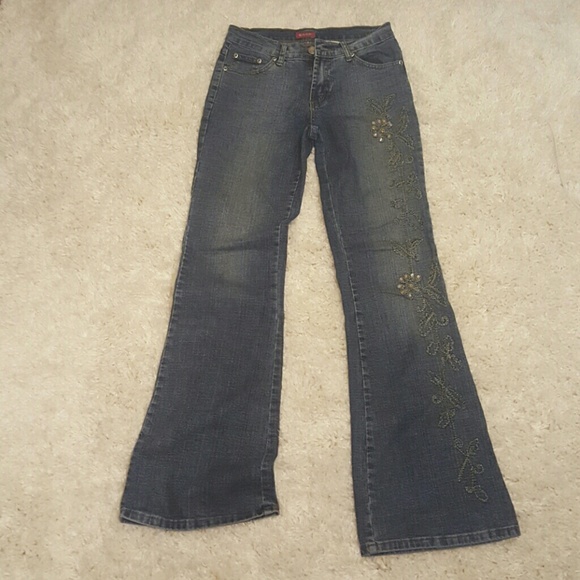 Slim fit jeans that flare of at the bottoms. With a nice Flower pattern going down one leg.