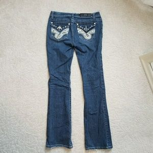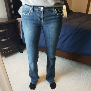 These are jeweled boot cut jeans from a small boutique in Colorado! They are in almost perfect condition except for a missing button on the back pocket which you can see in the photo. Also so distressing around the ankle