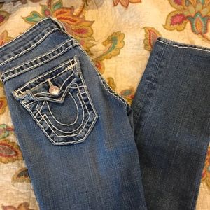 Preowned True Religion Jeans! In great condition & has extra minor stitching next to back left pocket (last photo). Size 24 and they’re flared at the bottom!