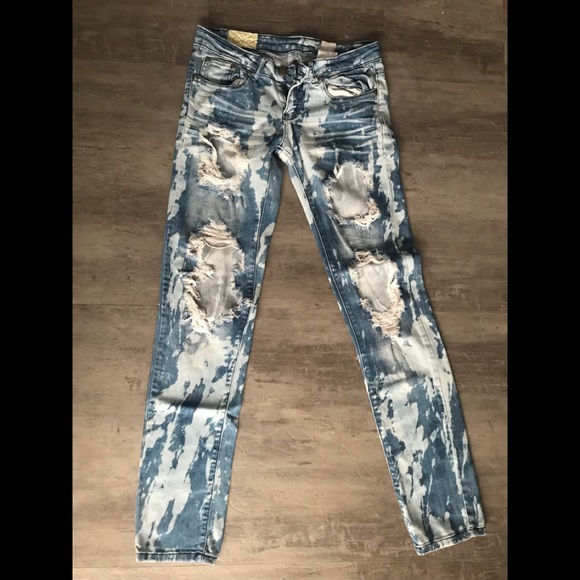 Distressed and bleached low rise skinny jeans