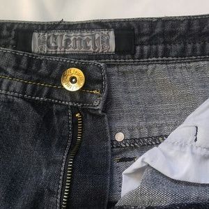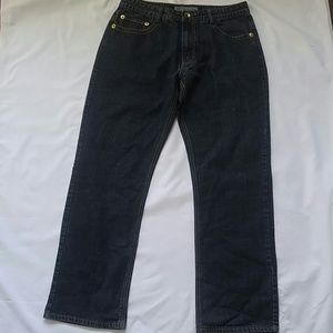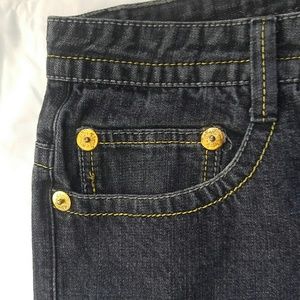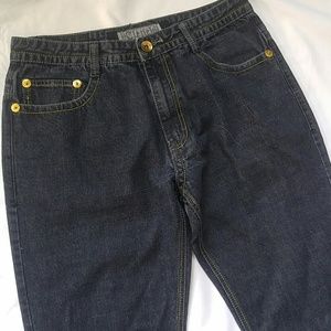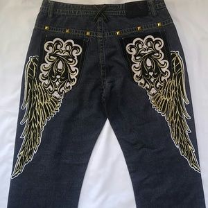 Jeans, zip fly, 5 pockets, with decorative gold stitched wing design over pockets with black and white applique with gold stud top trim, 33" inseam, gently worn excellent condition, 100% Cotton