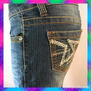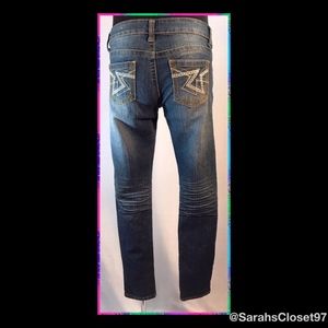 Blue Denim Stretch Jeans - Straight Leg - Bling Button - Distressed - good condition