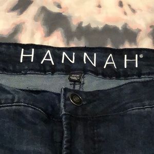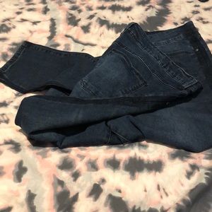 Dark blue denim with slight distressing. A dark stripe on side of jeans. Never wore