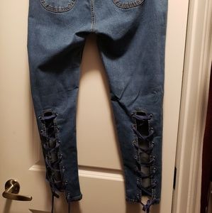 Criss cross straps on back of Jean's (back of calf to ankle)