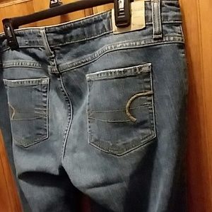 Low rise stretch denim blue jeans. Slight wear on bottom hems but overall good condition.