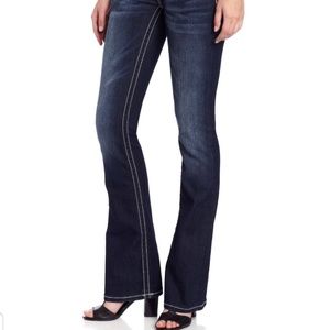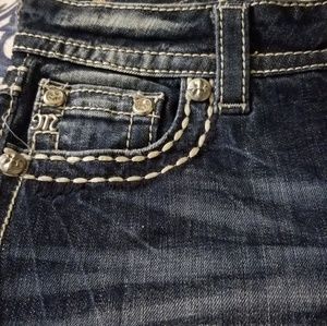Great pair of Miss Me signature back flap bootcut jeans. Embellished with thick stitch top stitching, crystal rivets and logo hardware. 5 pocket