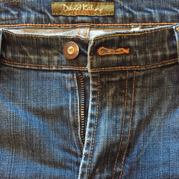 Flared leg, slight stretch jean. Bottom hems are raveling from wear. 32 inch leg. Pockets also have worn effect