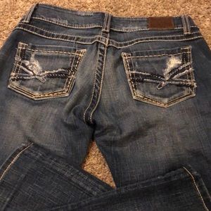 Super cute BKE slightly flared jeans! Comfortable dark denim. Cute stitching detail on back pockets! Not much of a flair to the leg openings, but a little winder than a straight leg. Pet free/smoke free home