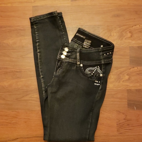 NWOT Three buttons, dark wash, no back pockets, faux front pockets. With embroidery.