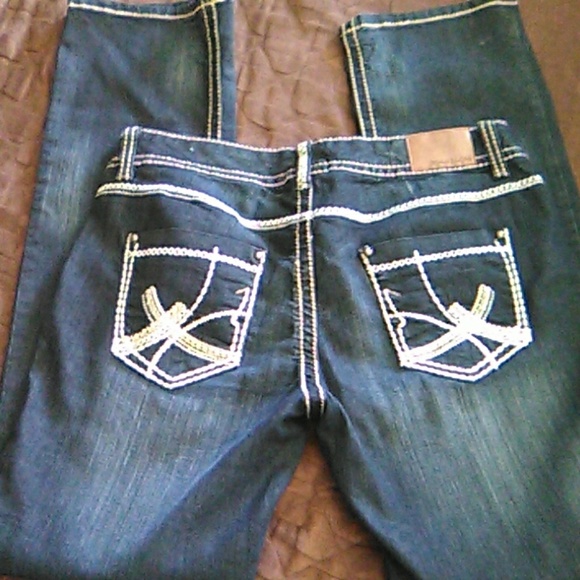 Maurice's blue denim slim boot jeans with Ivory and tan threading