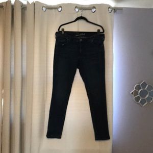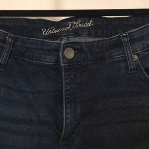 Stretchy material-very comfy, but wear a belt cause they slip down a little. Good condition.