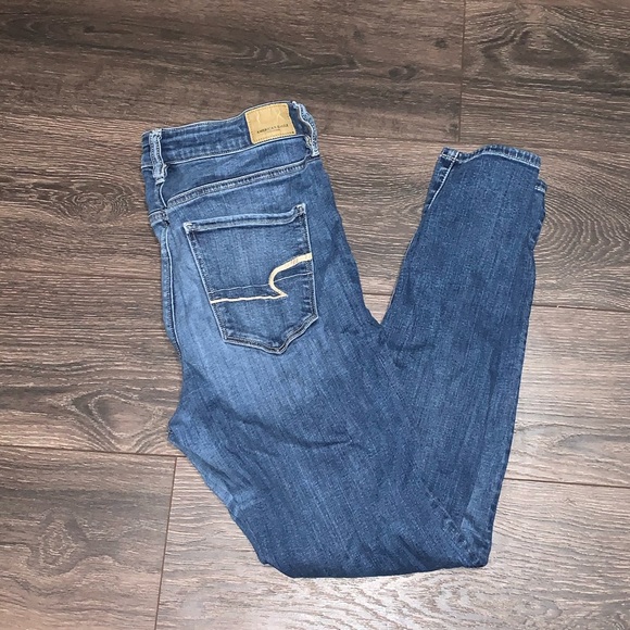 AE. High rise. Super stretch. No flaws. They look stained in the pics (on front) but those are just compression marks from being put up for so long!